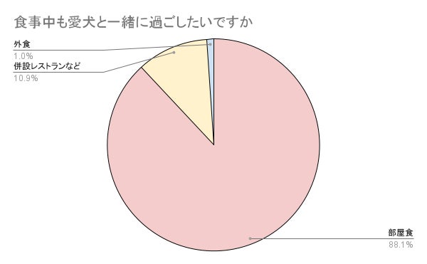 食事を重視されている方の中で、食事中も愛犬と過ごしたいかアンケートを行なったところ、部屋食にして食事中も一緒に過ごしたいという方が約9割、食事が美味しければ愛犬を部屋に留守番させて併設レストランや外食されるという方が約1割ほどいう結果になりました。
