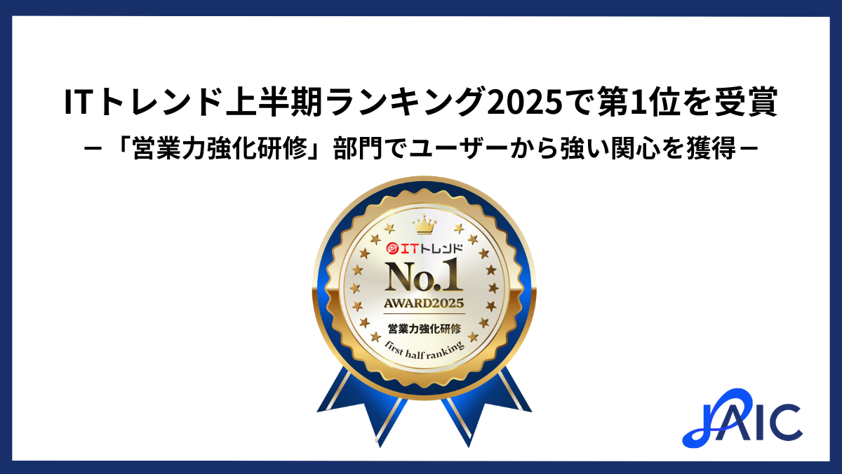 企業向けの教育研修事業と採用支援事業を展開する株式会社ジェイックは、当社が提供する研修サービス「営業研修~高くても売れる営業の真実~」が、株式会社Innovation & Co.が運営する法人向けIT製品の比較・資料請求サイト「ITトレンド」において、「ITトレンド上半期ランキング2025」の「営業力強化研修」部門で第1位を受賞したことをお知らせいたします。