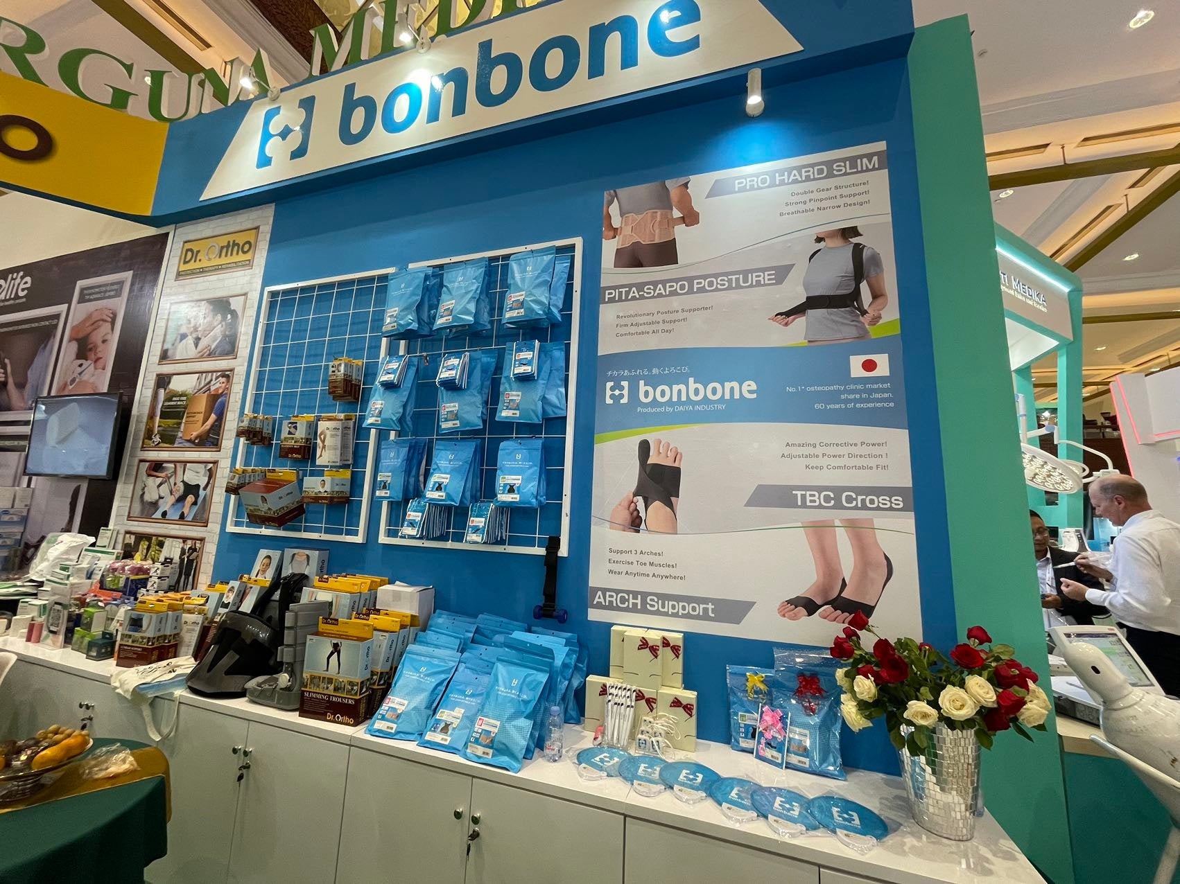 現在、日本国内の接骨院、鍼灸院を中心にご利用いただいている当社のサポーターブランド「bonbone」は、ベトナムを中心にアジアにおいて販売数が拡大しており、今回はインドネシアの医療関係者に「bonbone」ブランドの周知を行う事を目的に出展しました。