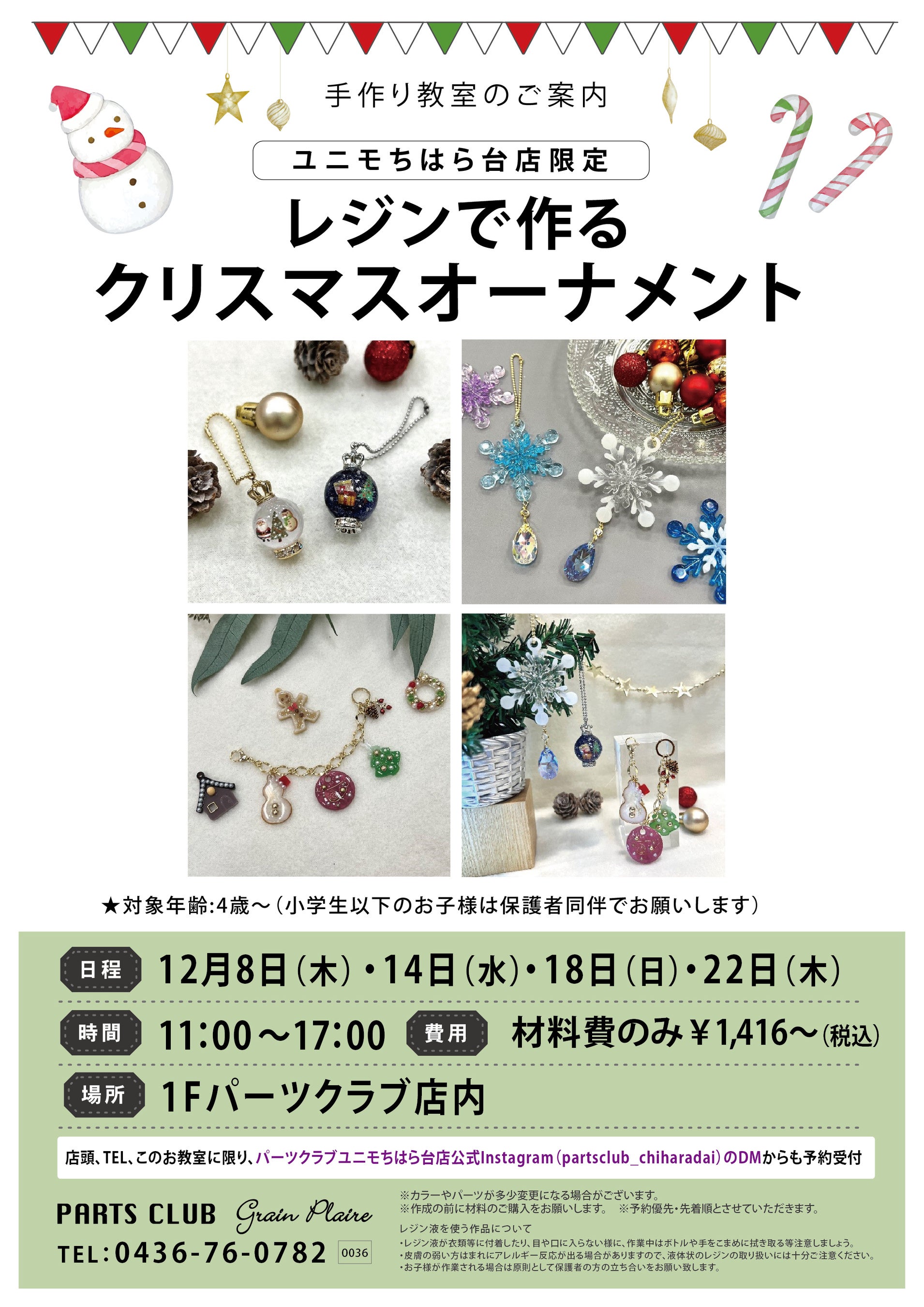 ハンドメイドでクリスマスを楽しもう!ビーズ&アクセサリーパーツショップPARTS CLUB、ユニモちはら台店にてクリスマスオーナメントが作れる「手作り教室」を開催。