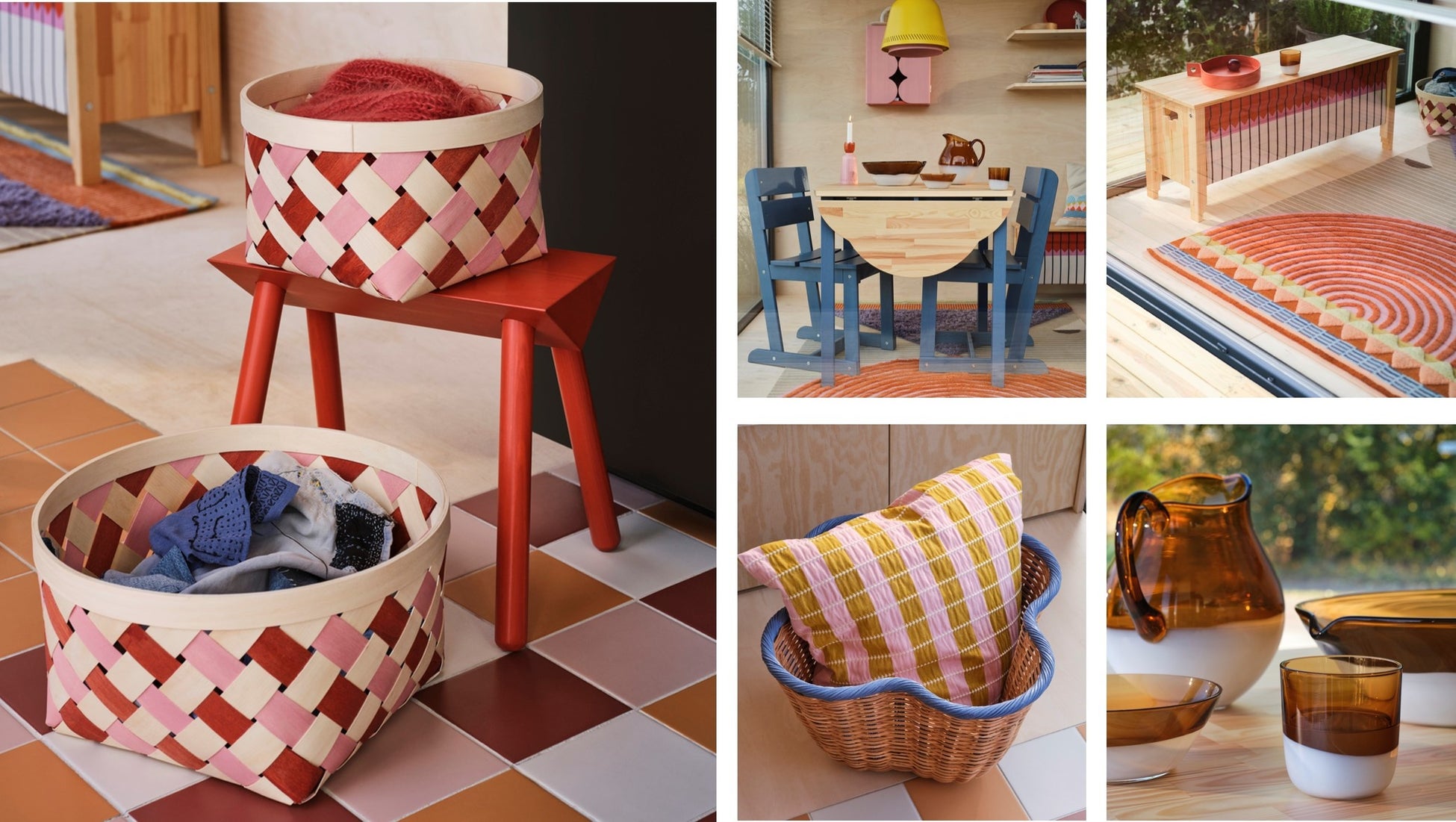 装飾的な小型のリカーキャビネットがあったことにインスパイアされた、絵画的な見た目の扉を開けても閉めても装飾的で魅力的なキャビネットや、カバノキの皮「näve(ネヴェル)」を編んでバスケットや箱を作っていたことに着想を得た、古代からの職人技で編まれたポプラ材のバスケット、さらには、スウェーデンで伝統的な「svepask(スヴェーパスク)」という小箱を元にデザインされた、木材を曲げて作ったしずく型のトレイなどが登場します。