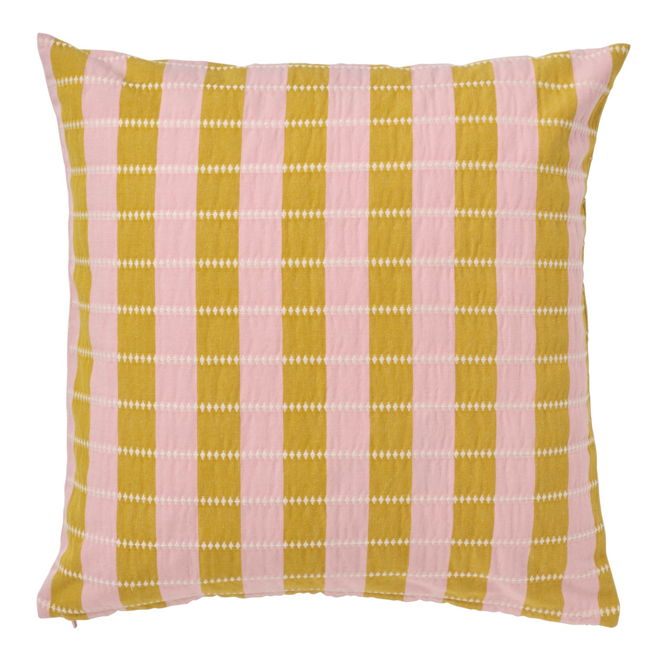 この柔らかな綿のクッションカバーは、異なる色のストライプが魅力的な模様はドビー織りによるもので、立体的な独特の風合いとナチュラルなシワが特徴です。明るい色使いの楽しい模様で、目に心地よく、柔らかな使い心地です。