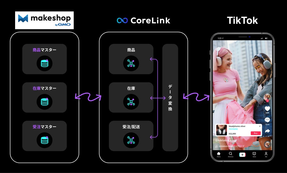 今回の連携により、「makeshop by GMO」をご利用のEC事業者様は「CoreLink for TikTok Shop」を利活用することで、高速かつかんたんに「makeshop by GMO」のデータ(商品・在庫・受注・キャンセル)情報をTikTok Shopへ連携可能になります。開発工程を経ることなく、TikTok Shopを新たな販路として活用し、売上拡大を図ることが可能です。