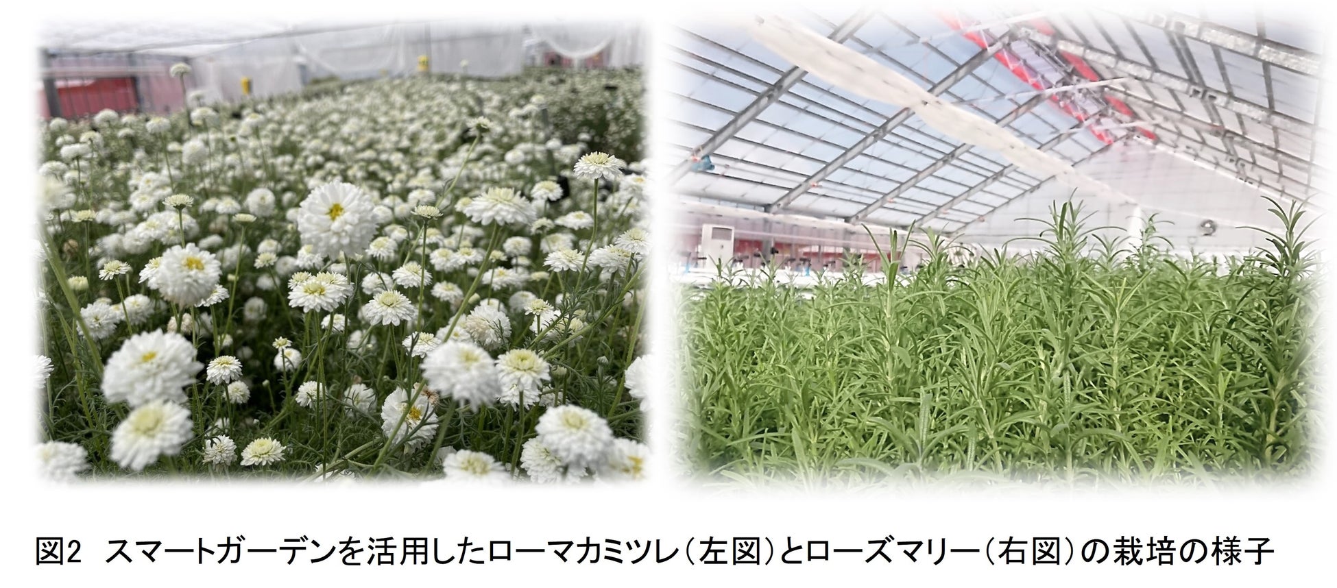 これらに加えて、「スマートガーデン」では、空調、日照など植物の生育に必要な環境を常時モニタリングしています。温度や照度などの栽培条件を高度管理することにより、水耕栽培での実績が少ないローマカミツレやローズマリーの量産に成功しました(図2)。さらに、それぞれの活性成分である「アピゲニン」と「ロズマリン酸」の量を高め、一定の基準以上になるタイミングで収穫するスキームも確立しました。