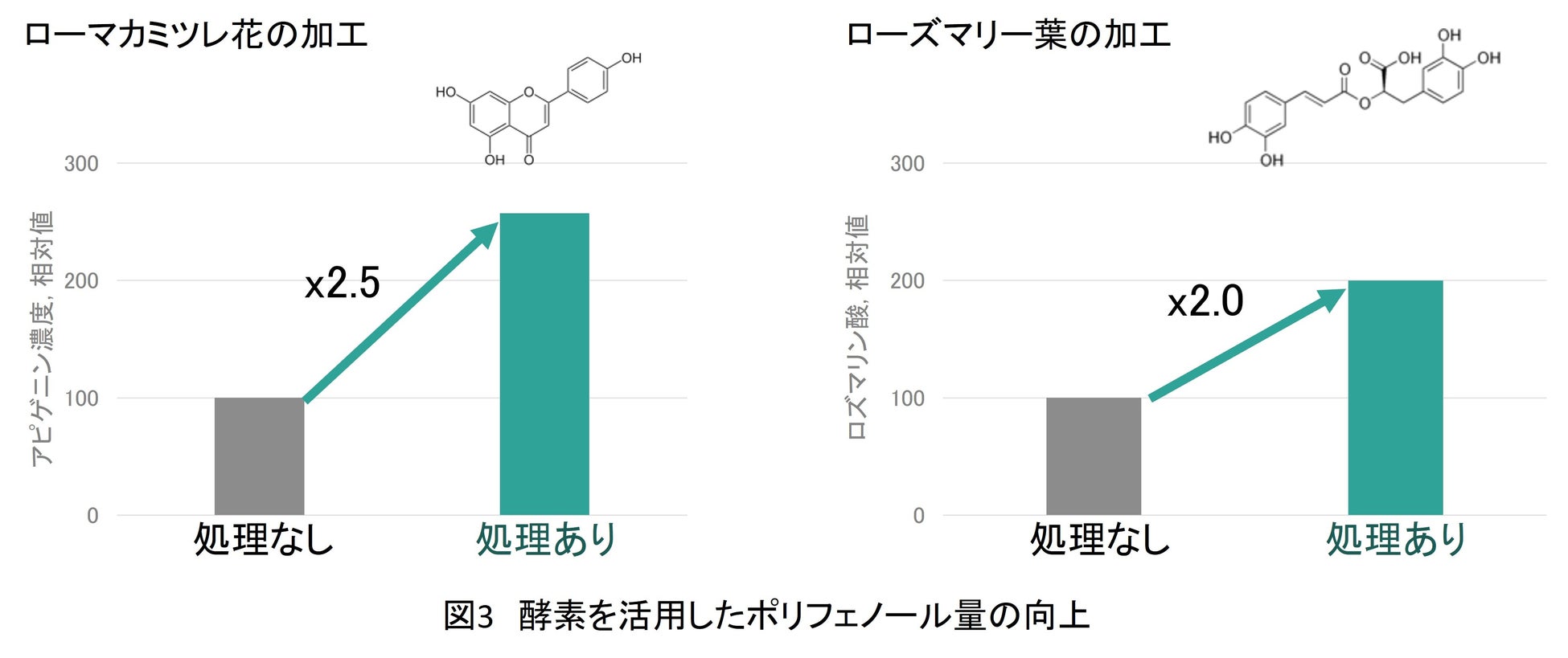 今回花王は、植物体自身が有する酵素の働きを制御することで、活性成分の1つであるポリフェノール量を増量させる検討を行いました。ローマカミツレの場合は、酵素の働きを活性化させることで、肌への効果を期待できるポリフェノール含有量が高まることを確認しました。*3(図3)