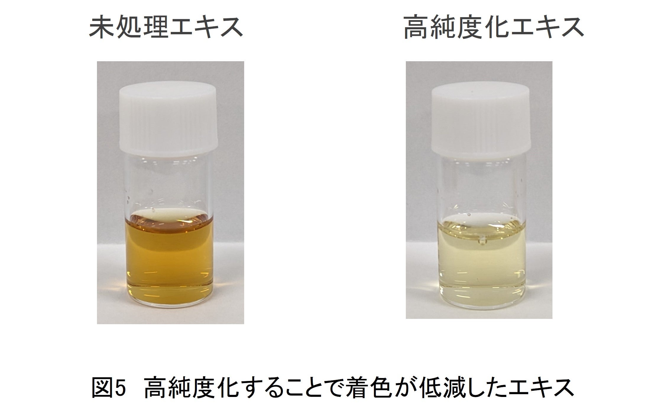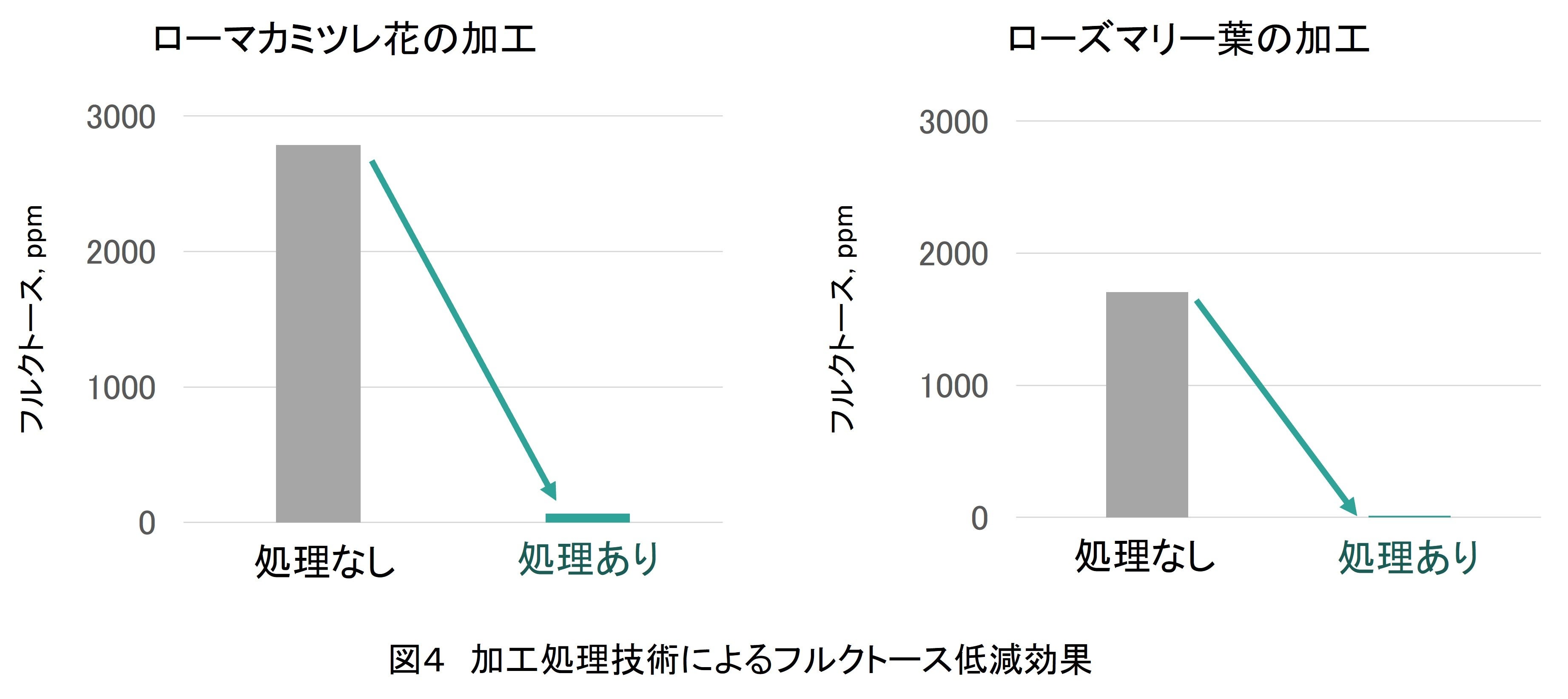 また、エキス中には、フルクトースなどの糖類をはじめ、最終製品の性状に悪影響を与えることもあるさまざまな不純物が混在しています。これに対し、活性成分は残しつつ、不純物を除去する独自プロセスを開発しました。この結果、ローマカミツレエキスで97%、ローズマリーエキスで99%、不純物の一つであるフルクトースを低減させることが可能となりました(図4)。