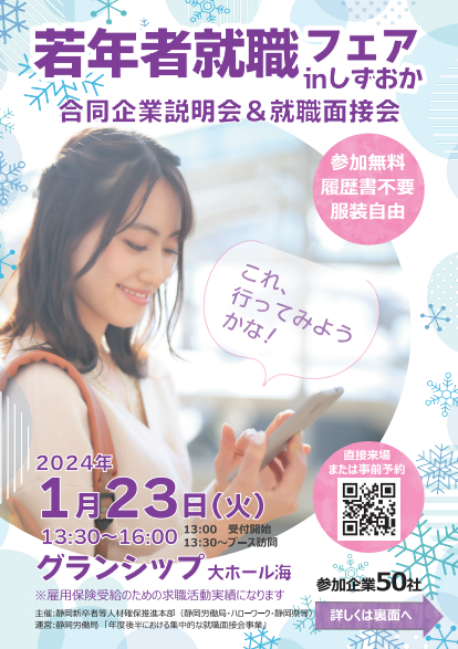 静岡新卒者等人材確保推進本部(静岡労働局、ハローワーク、静岡県等)は、2024年3月卒業予定の大学生等、既卒3年以内の方及び概ね45歳未満の方を対象として、静岡県内に就業地のある企業50社と直接会うことができる対面形式の就職面接会を開催いたします。