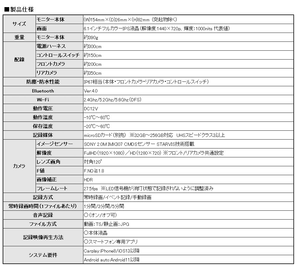 防塵・防水性能:IP67相当(本体・フロントカメラ・リアカメラ・コントロールスイッチ)