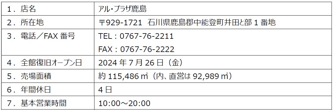 このたび、ようやく2階の復旧工事が終わり、全館の営業を再開いたします。復旧にあたり、建物の復旧だけではなく中能登町をはじめとした被災地域の復興を応援することにつなげたいと考え、単に元通りの売場に戻すのではなく日常生活に必要な衣食住遊が揃う、これまで以上に魅力あるお店となるよう売場を一新しました。一例として、お子様用品を集めたキッズライフスタイルショップ「kids fest」、寝具や生活用品の品揃えが豊富な「ゆたりら」、ペット用品が豊富に揃う「CoCoペット」が新しく誕生します。また、被災により売場をなくした地域の商店の方への販売スペースの提供や地域イベントの発表の場など、地域の皆様が集う場所や機会をご提供します。当店は新たな売場で心機一転、地域にとって「なくてはならない存在」を目指してまいります。