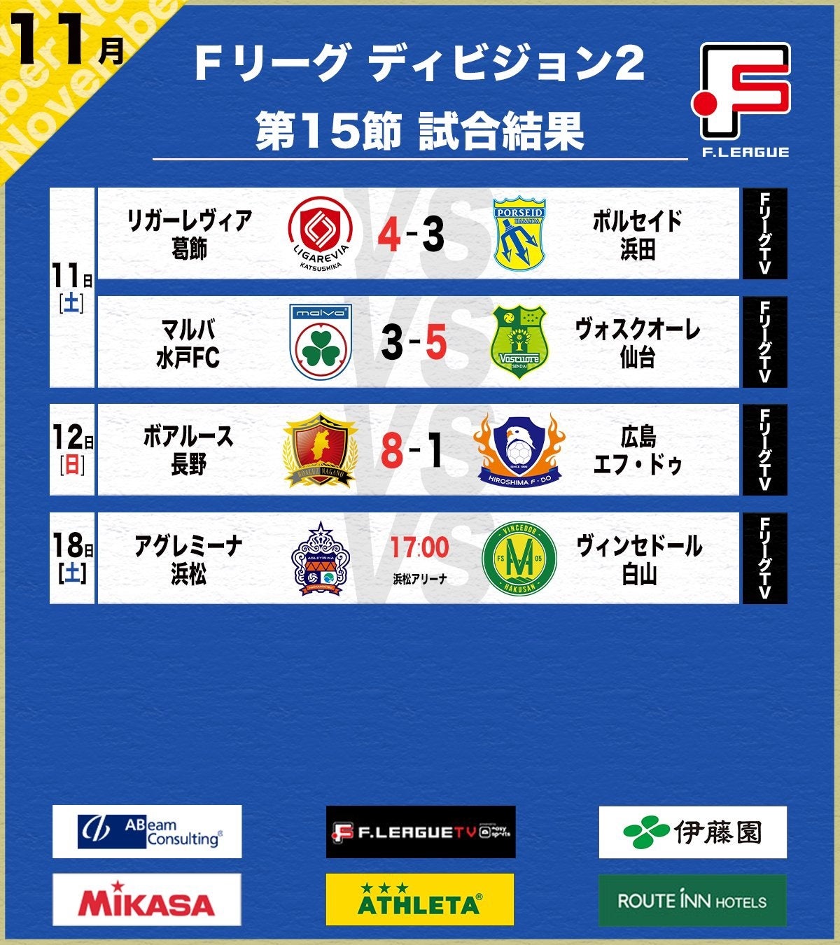 11月18日(土)17:00キックオフ アグレミーナ浜松 vs. ヴィンセドール白山