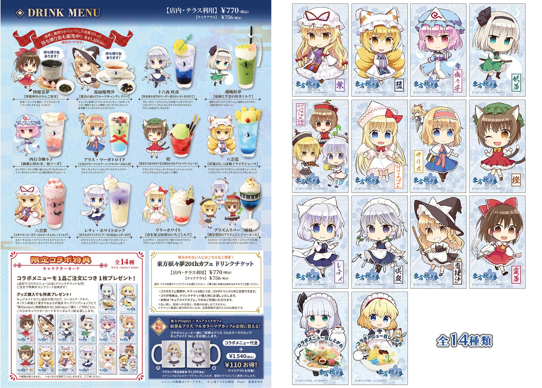 また、先行販売の「東方Project×キュアメイドカフェ 妖夢&アリス フルカラーマグカップ」がお得に手に入るマグカップ付きドリンク、コラボメニューご注文で貰える限定特典【コラボ限定キャラクターカード(全14種)】もご用意いたしました。