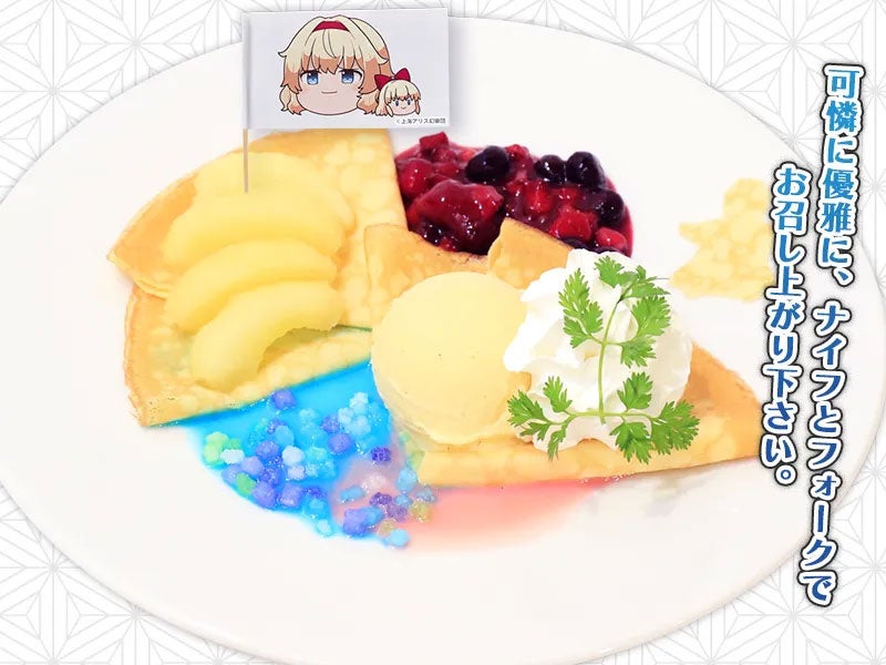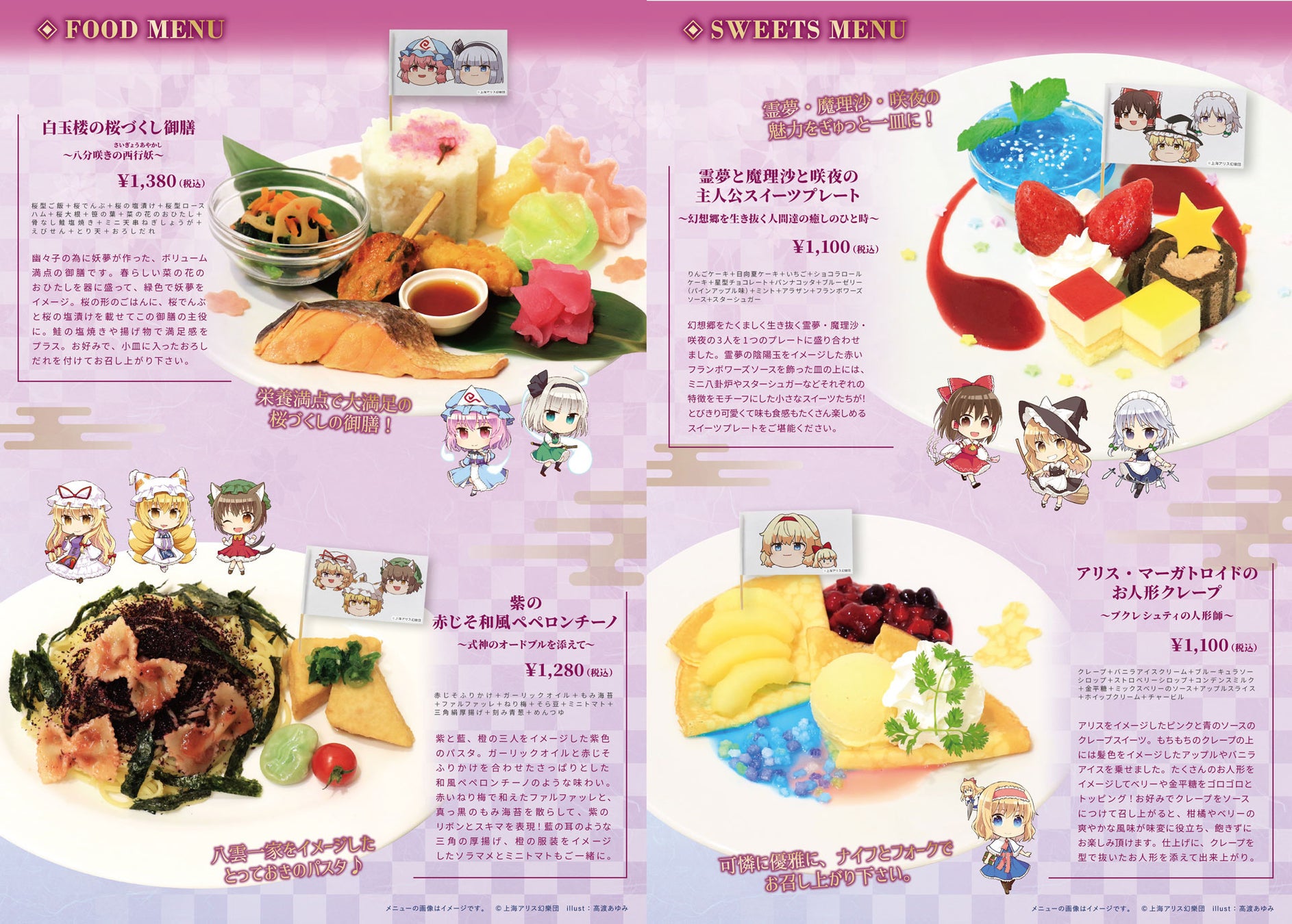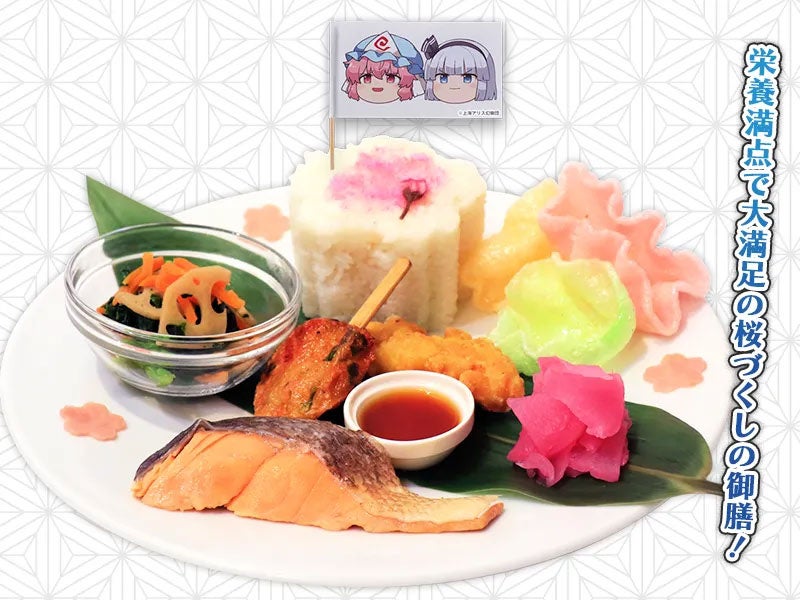 春らしい「白玉楼の桜づくし御膳 ~八分咲きの西行妖(さいぎょうあやかし)~」や、霊夢と魔理沙と咲夜の「スイーツプレート」、コラボドリンクなど、霊夢や魔理沙、アリス、妖夢たちをイメージしたコラボメニューがずらりとラインナップいたします。
