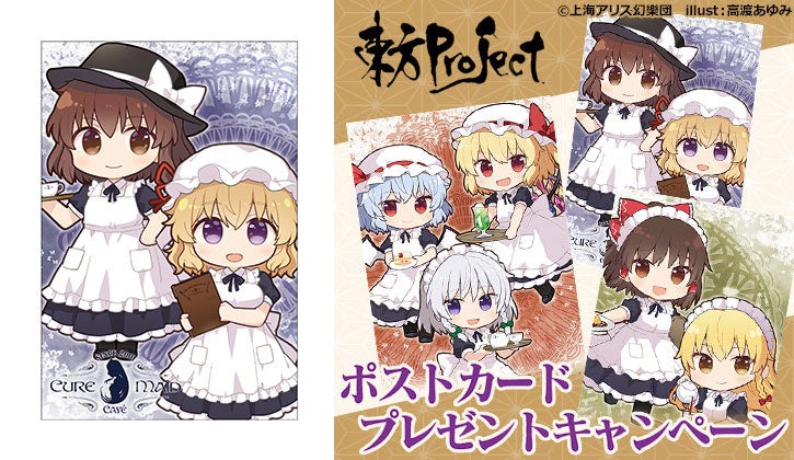 キュアメイドカフェ店内や同フロア、ジーストア・アキバ、オノデン新館1Fの「東方やおよろず商店 ポップアップショップ」 にて『東方Project』関連商品を1,500円(税込)ご購入・ご予約ごとに、カフェで配布しているコラボ限定キャラクターカード(全14種)をランダムで1枚お渡しします。