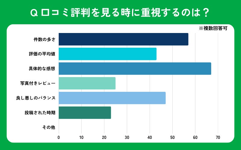 ・口コミ評判を見る際に重視するのは「具体的な感想の内容」「口コミ件数の多さ」「高評価・低評価のバランス」。