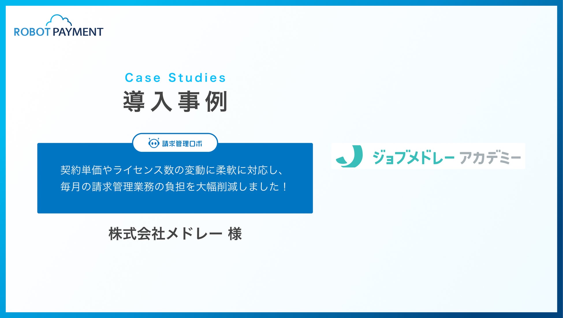株式会社ROBOT PAYMENT(本社:東京都渋谷区、代表取締役:清久 健也、証券コード:4374、以下「ROBOT PAYMENT」)は、請求・債権管理システム「請求管理ロボ」が、株式会社メドレーが提供するジョブメドレーアカデミーの導入事例を公開したことをお知らせします。