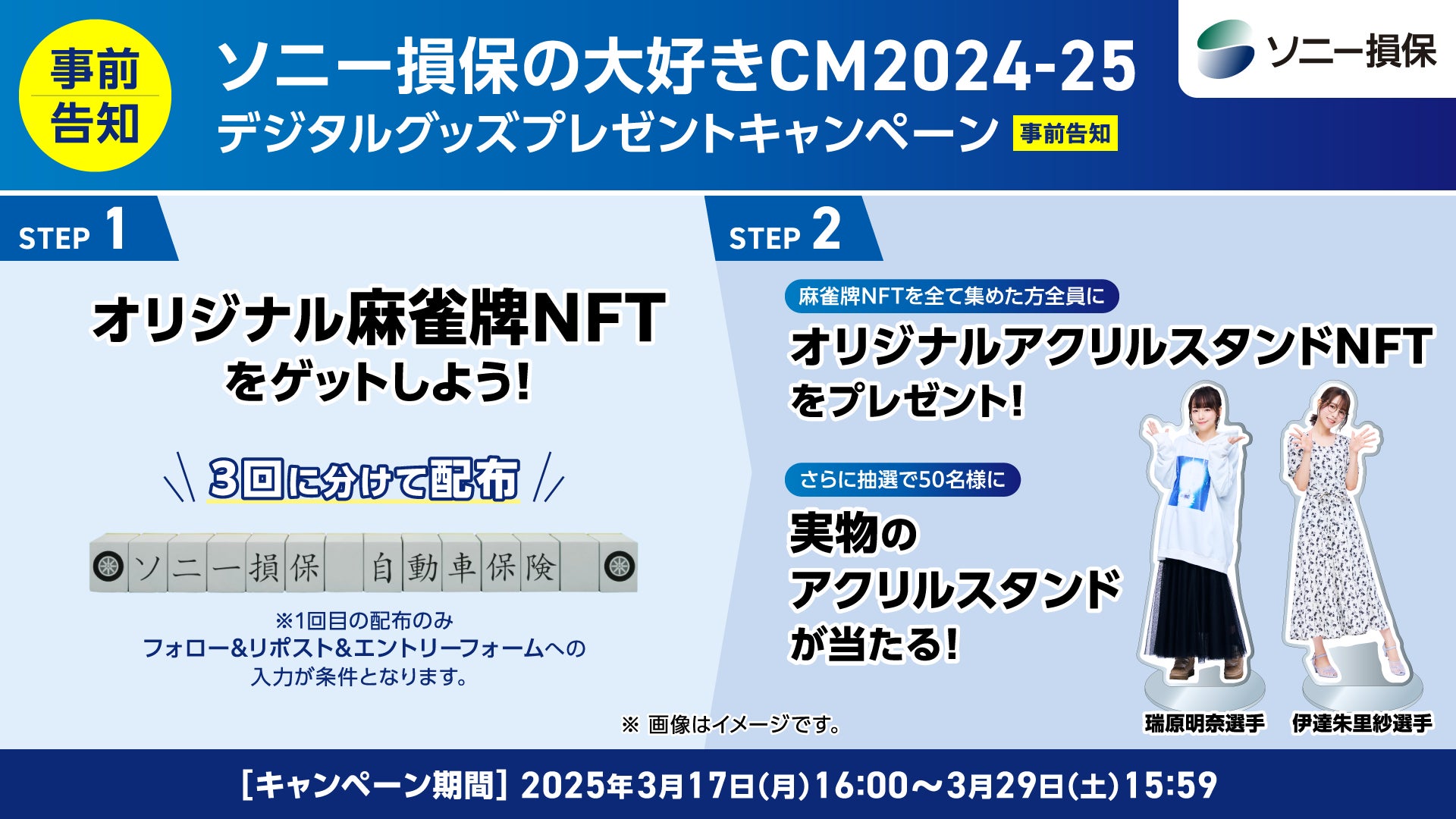 キャンペーンの詳細は、2025年3月17日(月)にソニー損保のX公式アカウントやイベント・キャンペーンページでご案内します。