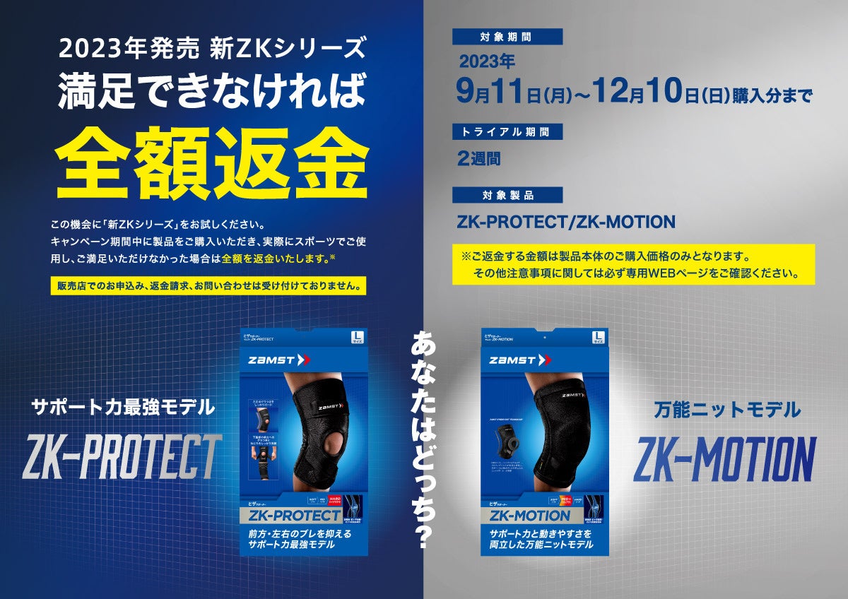キャンペーン期間中に、ZK-PROTECT、ZK-MOTIONをご購入いただき、実際にスポーツでお試しください。もし、ご満足いただけなかった場合、全額返金(※)をさせていただくキャンペーンとなります。