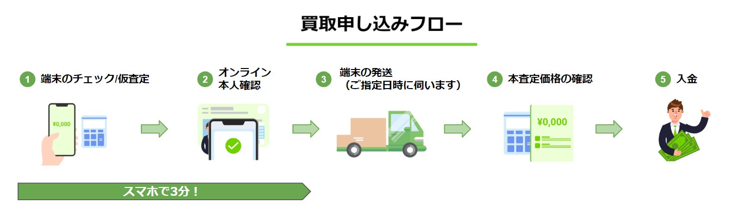 申し込み:端末の仮査定からオンライン本人確認まで、スマホを用いて3分で完了させることが可能です。