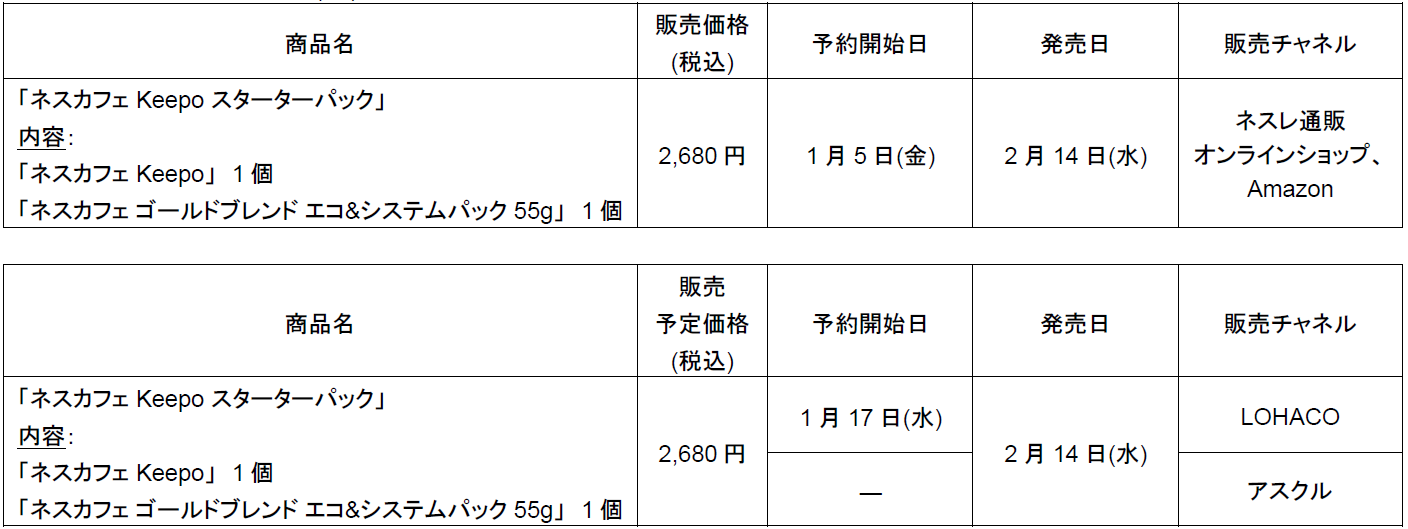 「ネスカフェ Keepo スターターパック」は、ネスレ通販オンラインショップ、Amazon、LOHACOで先行予約の受付を行い、発売日の2月14日(水)以降に順次発送します。