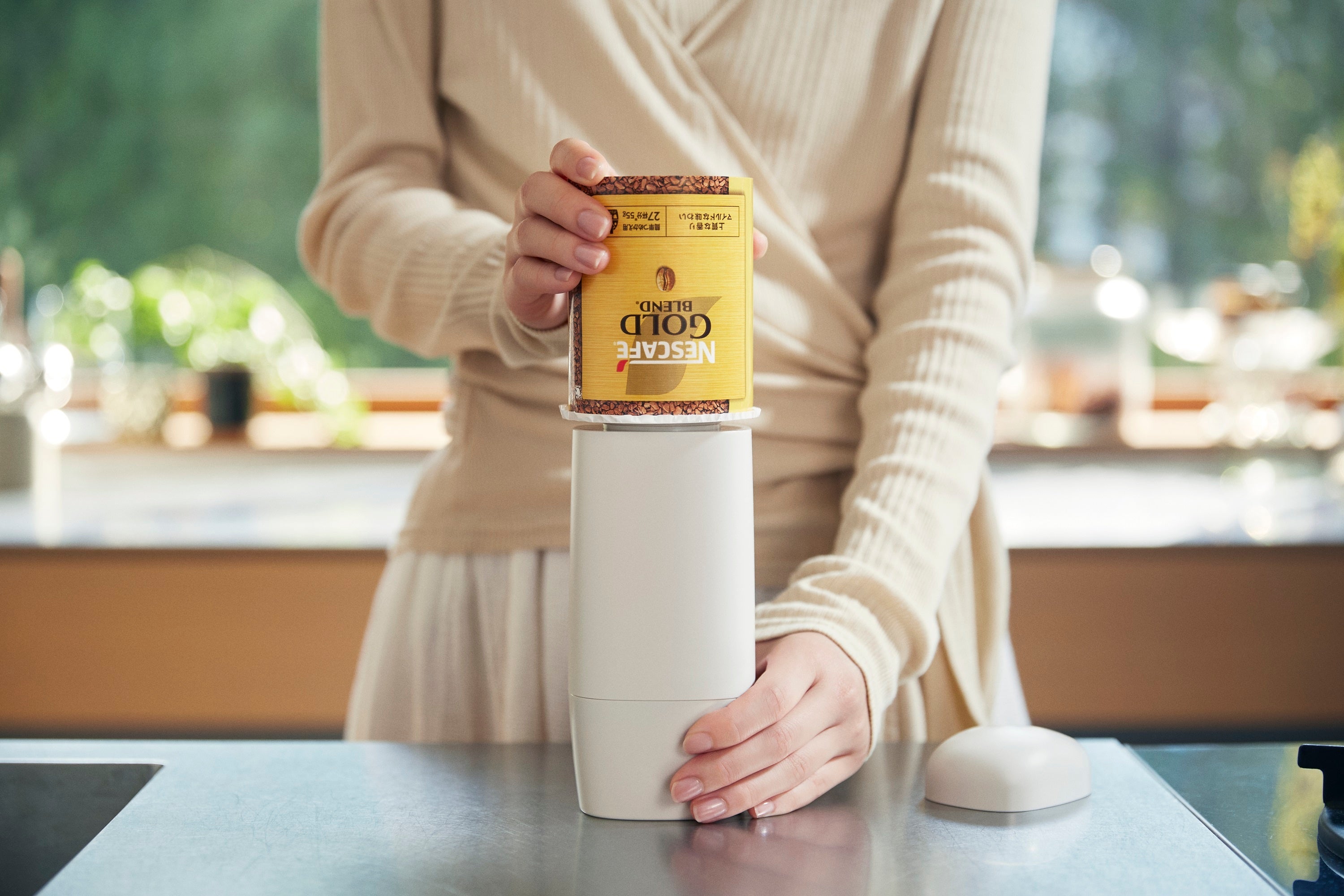 このたび新発売する「ネスカフェ Keepo」は、シンプルな容器にさりげなく「ネスカフェ」のアクサン(※フランス語で「アクセント」の意味)マークがポイントとしてあしらわれた、インテリアになじむスタイリッシュなデザインが特長の密閉キャニスターです。袋タイプのソリュブルコーヒー ユーザーの多くが、購入後に別の容器に「詰め替え」を行っている一方で、“製品をそのままを部屋に置くと生活感が出てしまう”、“他の瓶に詰め替えて湿気ってしまわないか心配”、“一杯分を計るのが面倒”といった声が多く聞かれました。高い気密性で湿気からコーヒーの香りを守る「ネスカフェ Keepo」を使用すれば、「ネスカフェ ゴールドブレンド」の味や香りをキープして詰め替えられるだけでなく、下部のダイヤルを回転させるだけで、適量(※1)を出すことができます。