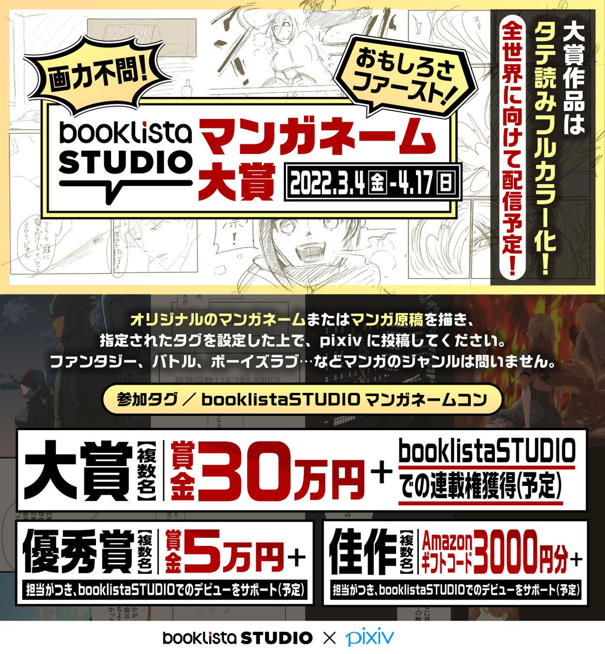 pixivにて「booklistaSTUDIOマンガネーム大賞」の作品募集を本日から開始 大賞受賞作品は賞金のほか、タテ読みコミックの原作として連載化