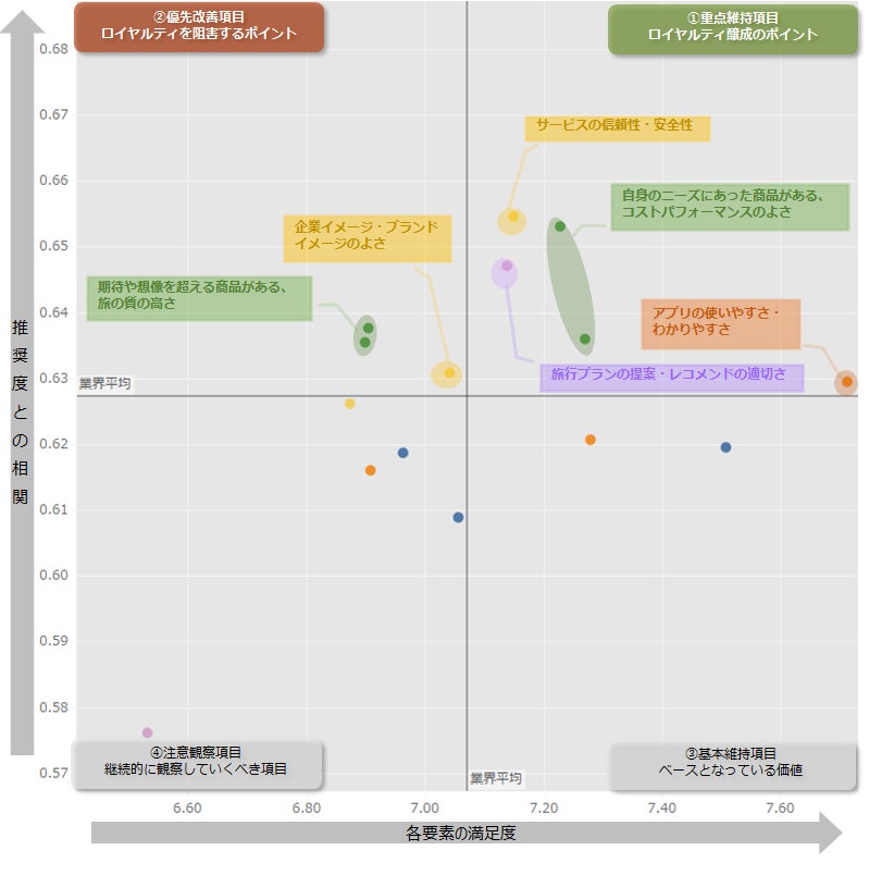 一方でロイヤルティ向上のために優先的に改善が期待される項目としては「期待や想像を超える商品がある」や「旅の質の高さ」といった項目となりました。また、「企業イメージ・ブランドイメージのよさ」も改善が期待される結果となりました。