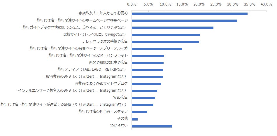 普段、旅行先を決めたり旅行の計画を立てるのにあたりどのようなところから情報を探しているか調査をしたところ、最も多いのは「家族や友人・知人からのお薦め」(34.4%)が最も高くなりました。次いで「旅行代理店・旅行関連サイトのホームページや特集ページ」(31.3%)、「旅行ガイドブックや情報誌」(24.3%)と続きました。