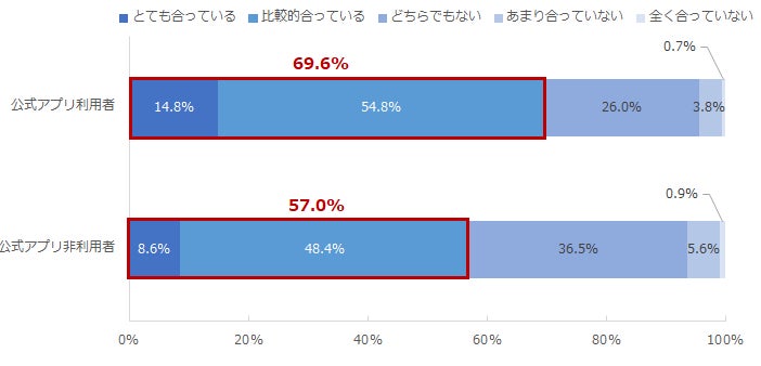 該当の旅行会社から提供される旅行先に関する情報や、旅行プランの提案などが、自分のニーズや嗜好にあったものになっているか、公式アプリの利用有無別に分析をしたところ、「とても合っている」または「比較的合っている」と回答した利用者は公式アプリ利用者では69.6%となり、非利用者に比較して高くなりました。公式アプリを使って利用者それぞれに合った情報を発信していくことの重要性がうかがえる結果となりました。