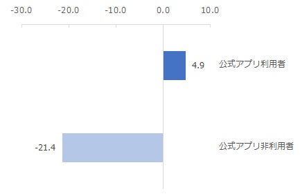 1年以内の公式アプリの利用状況について調査したところ、全体の26.9%が公式アプリを利用している結果となりました。また公式アプリ利用有無別にNPSも調査したところ、公式アプリ利用者のNPSは4.9ポイントとなり、非利用者の-21.4ポイントを上回りました。