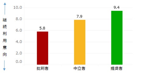 該当の旅行会社の利用者に対し、今後の継続利用意向を0~10の11段階でたずねたところ、 「推奨者」(推奨度が「9」~「10」の回答者)は平均9.4ポイント、「中立者」(推奨度が「7」~「8」の回答者)は平均7.9ポイント、「批判者」(推奨度が「0」~「6」の回答者)は平均5.8ポイントとなり、推奨度が高いほど継続利用意向も高くなる結果となりました。