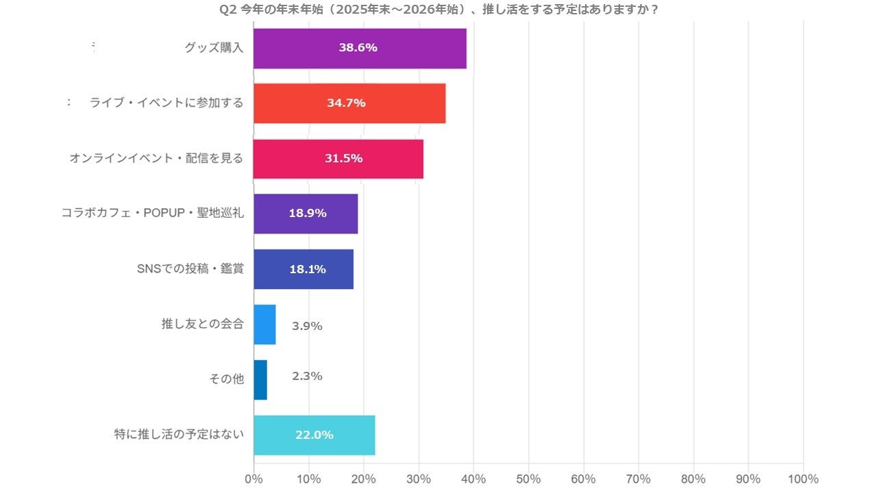 予定の内訳では「グッズ購入」(38.6%)が最多で、「ライブ・イベントに参加する」(34.7%)、「オンラインイベント・配信を見る」(31.5%)と続きました。