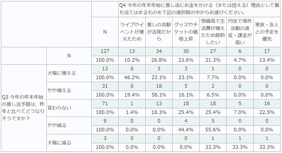 一方、「やや減る」「大幅に減る」層では、「物価高で生活費が増えた」(50.0%)、「グッズ・チケットの価格上昇」(33.3%)に回答が集中。”推しへの気持ちは変わらないが、家計を優先せざるを得ない”という社会人ならではの事情も推察されます。