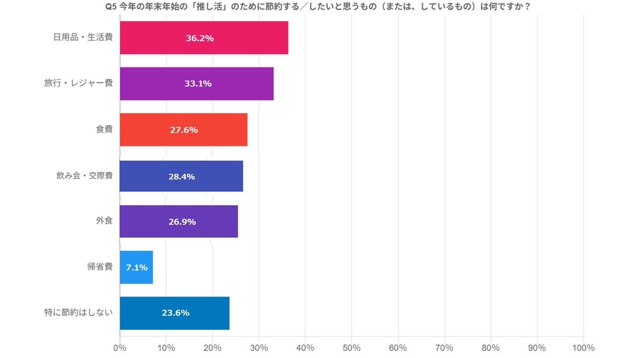 「年末年始の「推し活」のために節約する(したい/している)と思うもの」を聞いたところ、「日用品・生活費(36.2%)の次に、「旅行・レジャー費」(33.1%)、「飲み会・交際費」(28.4%)との回答が続き、「特に節約はしない」は(23.6%)でした。「推し活で最もお金を使う予定のジャンル」は、「グッズ」(29.9%)、「コンサート・イベント」(26.0%)で約半数を占めました。