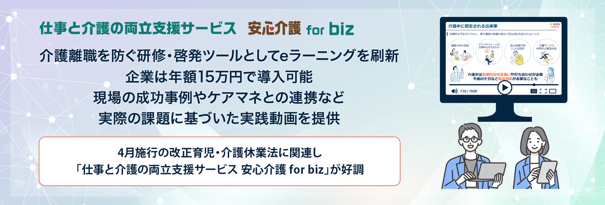 株式会社エス・エム・エス(本社:東京都港区、代表取締役社長:後藤夏樹、東証プライム、以下「当社」)は、介護離職を防ぐ「仕事と介護の両立支援サービス 安心介護 for biz」(URL:https://i.ansinkaigo.jp/redirect_links/1855)において、eラーニングコンテンツを刷新したことをお知らせします。本コンテンツは、実際の課題に基づいた実践動画一式を年額15万円(税別)の低価格で提供することが特長です。