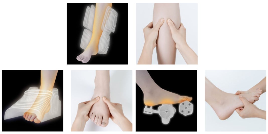 ふくらはぎ・足首から、足の甲、足裏まで全体をマッサージ。リズミカルな動きで細かく刺激し、もみほぐします。同時に足裏も強めにマッサージ。