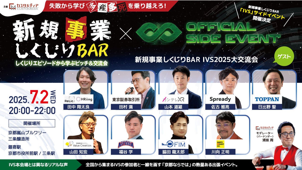 事業共創カンパニーである株式会社Relic(本社:東京都渋谷区、代表取締役CEO:北嶋 貴朗、以下「Relic」)は、2025年7月に開催される国内最大のスタートアップカンファレンス「IVS2025」の公認サイドイベントである「新規事業しくじりBAR 『IVS2025』大交流会」に登壇することをお知らせします。開催は7月2日(水)20時から、京都嵐山ブルワリー 三条醸造所にて開催されます。