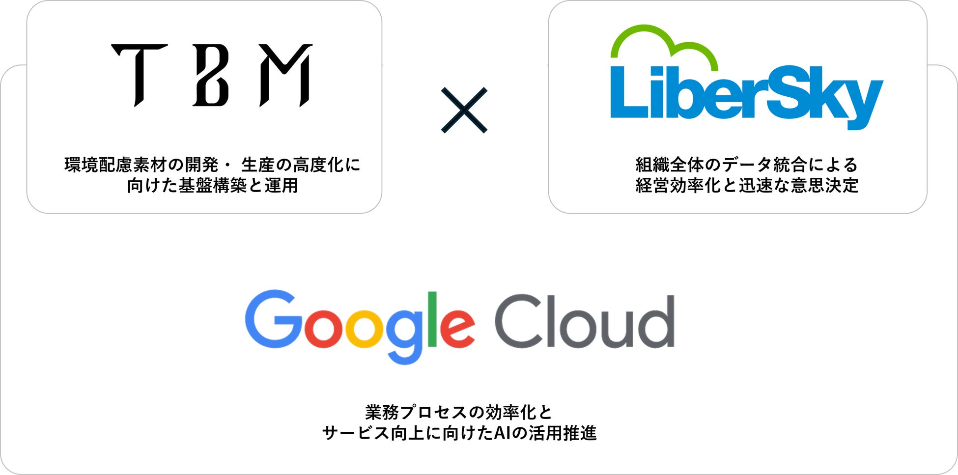 株式会社TBM(本社:東京都千代田区、代表取締役CEO:山﨑敦義、以下TBM)は、デジタルトランスフォーメーション(DX)推進の一環として、この度、Google Cloudパートナー企業である株式会社リベルスカイ(本社:東京都中央区、代表取締役社長:山﨑真、以下リベルスカイ)との戦略的パートナーシップを開始したことをお知らせいたします。本パートナーシップは、Google Cloudの最新クラウドテクノロジーを活用することで、国内外における事業成長と経営基盤の強化を図り、生産性の最大化や高度な技術開発、業務プロセスの効率化を実現する環境を構築することを目的としています。