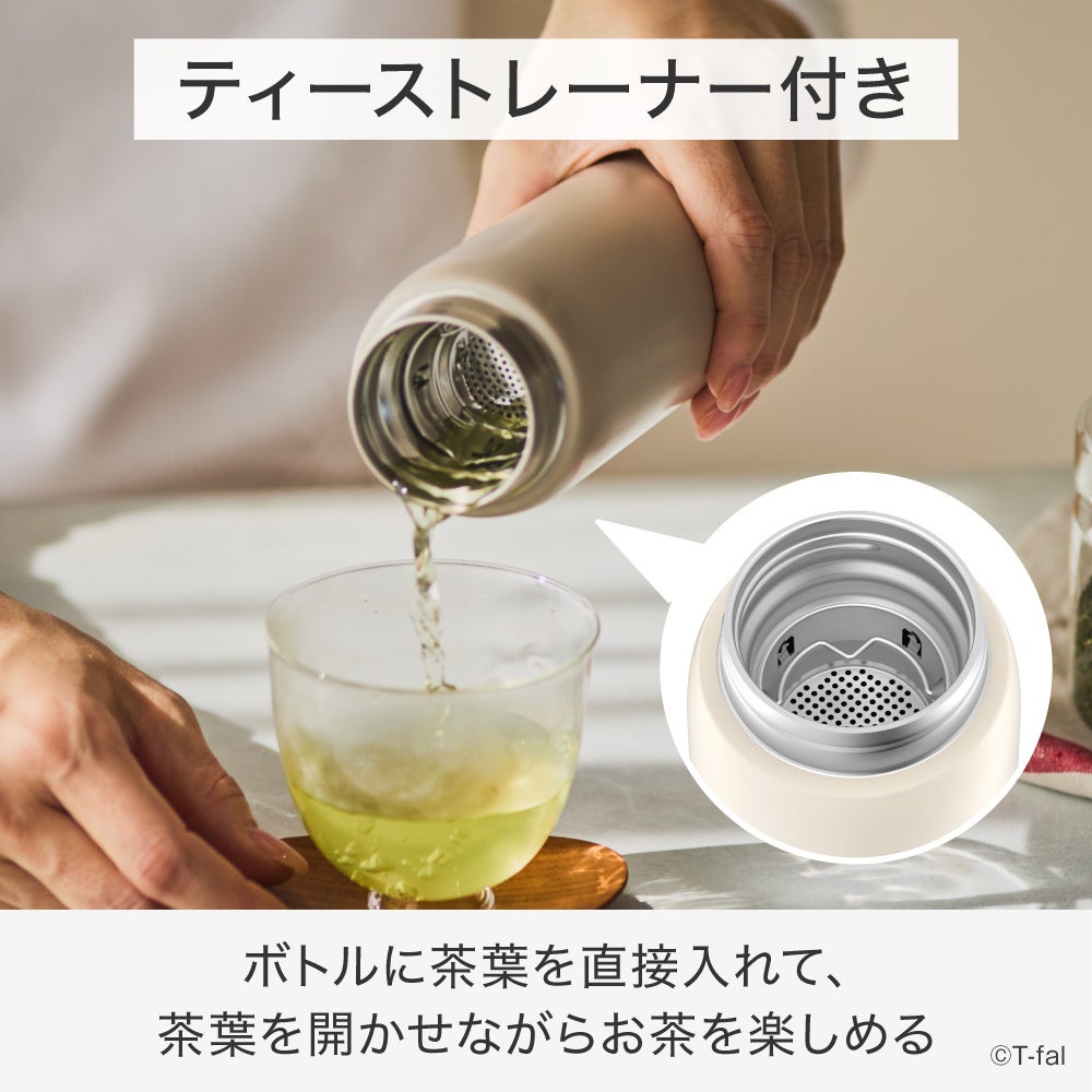 保温・保冷にも対応(※)しており、寒い季節には温かいドリンクを、暑い季節には冷たいドリンクをおいしい温度のまま長く楽しめます。容量は450mlで、テイクアウトドリンクも入るたっぷりサイズ。スクリュータイプでしっかり密閉できるため、持ち運び時も漏れにくく安心です。また、ティーストレーナー付きのため、ボトルに直接茶葉を入れて、茶葉を開かせながらお茶を楽しむことができます。サビにくい高品質ステンレス素材を採用し、パッキンを取り外して洗える分解栓なので、お手入れも簡単です。