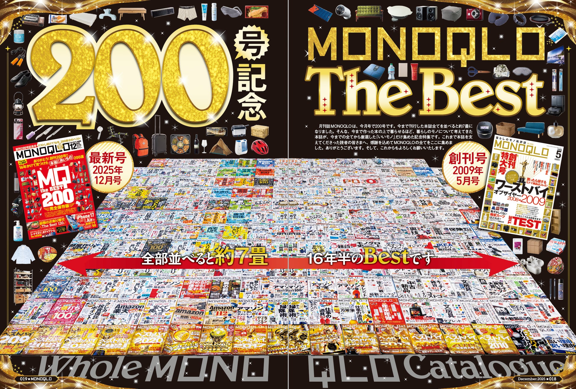 月刊誌MONOQLOは、今月号で200号です。今まで刊行した本誌全てを並べると約7畳になりました。そんな、今まで作った本の上で暮らせるほど、暮らしのモノについて考えてきた本誌が、今までの全てから厳選した「いいモノ」だけ集めた記念特集です。これまで本誌を支えてくださった読者の皆さまへ、感謝を込めてMONOQLOの全てをここに集めました。ありがとうございます。そして、これからもよろしくお願いいたします。