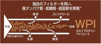 ホエイとは、チーズを製造する際にできる上澄みの液体のことで、タンパク質を多く含んでいます。そこから水分を取り除いてタンパク質を濃縮したものが濃縮ホエイタンパク、いわゆるWPC(ホエイプロテインコンセントレート)といわれています。WPI(ホエイプロテインアイソレート)はそこからさらに不純物を取り除くため、タンパク質の含有量が90%と非常に純度が高く、吸収がその他のプロテイン原料よりも早くなっています。ダイエットやトレーニングでタンパク質を効率的に摂りたい方におすすめです。カロリーが気になる人や、乳製品などでおなかを壊しやすい人にも安心して摂取していただけます。