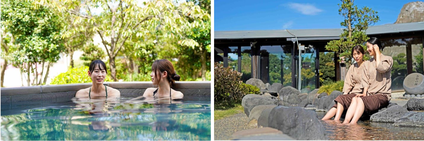 高濃度炭酸泉の「池泉庭園の湯」や足湯「遊歩の湯」でのんびりおしゃべり(館内着は別途有料)