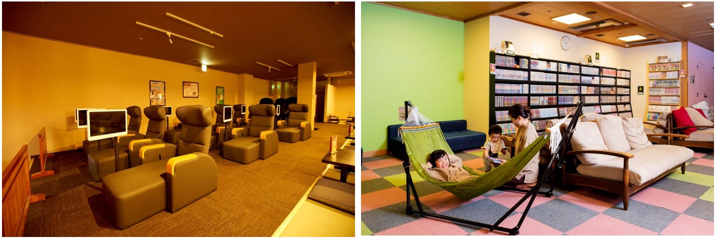 リクライニングチェアにテレビモニターが設置されているスペースや、畳の上にごろりと横になれるスペースなどいずれも追加料金無しでご利用いただけます。