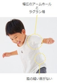 縫製をフラットシーマにすることでチクチクやゴロつきを軽減し、脇の縫い目や洗濯表示タグをなくすことで着用時のストレスを感じにくい仕様に。また、子どもの自由な動きを妨げないよう、腕を動かしやすいラグラン袖や窮屈さを感じにくい幅広のアームホールを採用し、腕をあげてもおなかが出にくい長めの着丈に設計しました。