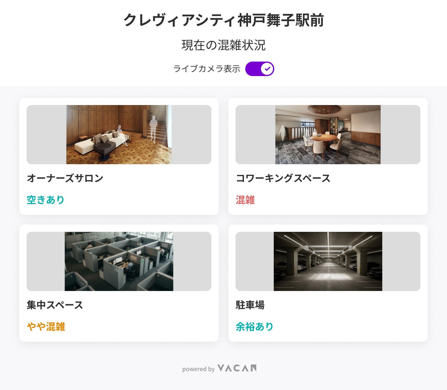 AI技術で混雑状況を可視化し、ムダな「待つ」をなくすサービスを提供する株式会社バカン(本社:東京都千代田区、代表取締役:河野剛進、以下「バカン」)は、「共用スペースの混雑可視化サービス(VACAN AIS)」が、兵庫県神戸市垂水区に誕生する分譲マンション「クレヴィアシティ神戸舞子駅前」に導入されたことをお知らせいたします。分譲マンションにおける本サービスの導入は今回が初※となります。