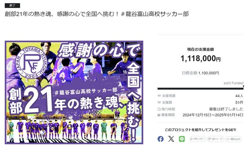 チーム・団体やアスリートを支援するスポーツ専⾨クラウドファンディングを展開するスポチュニティ株式会社(東京都 中央区、以下スポチュニティ)は、龍谷富山高等学校サッカー部が主催するクラウドファンディングプロジェクト「創部21年の熱き魂、感謝の心で全国へ挑む!」を実施し、支援金額1,118,000円(目標達成率101%)を達成して終了しました。今回得た支援金は、2024年12月28日〜2025年1月13日開催の全国選手権大会の参加費用に活用されました。