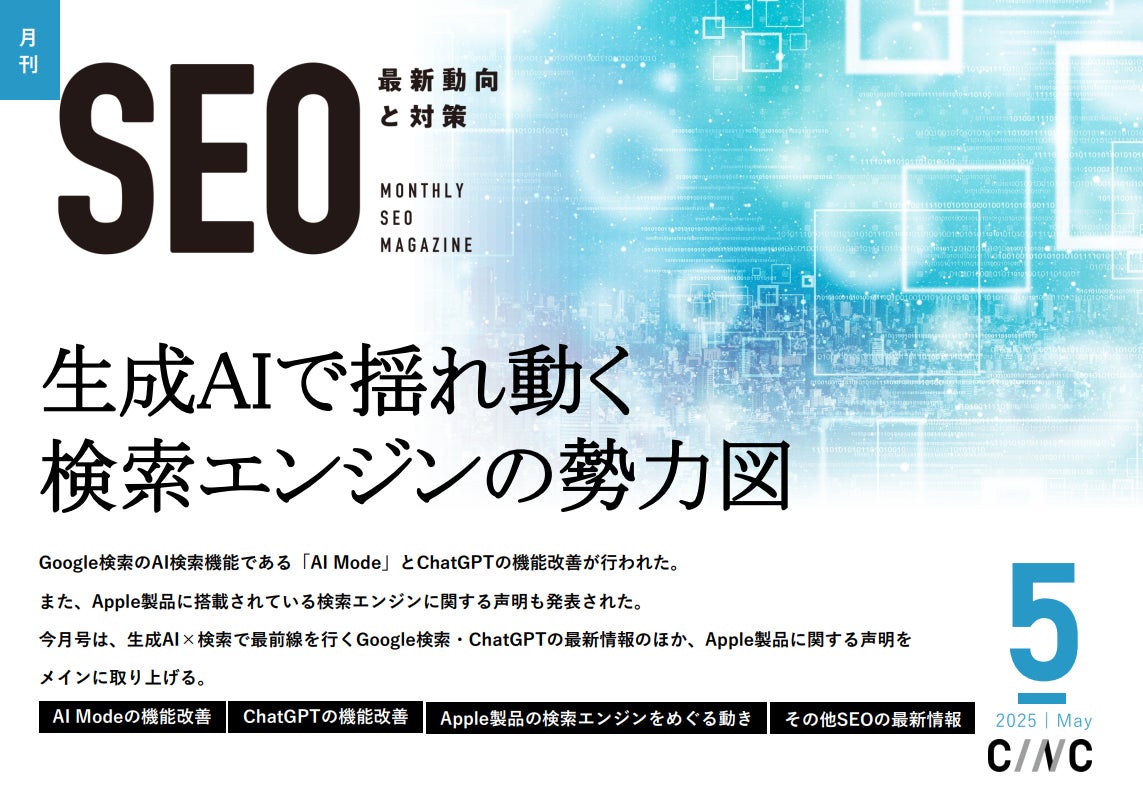 株式会社CINC(本社:東京都港区、代表取締役社長:石松友典、以下CINC)は、毎月特定のテーマのSEO最新動向と対策についてレポートする「月刊SEO」の5月号を公開しました。