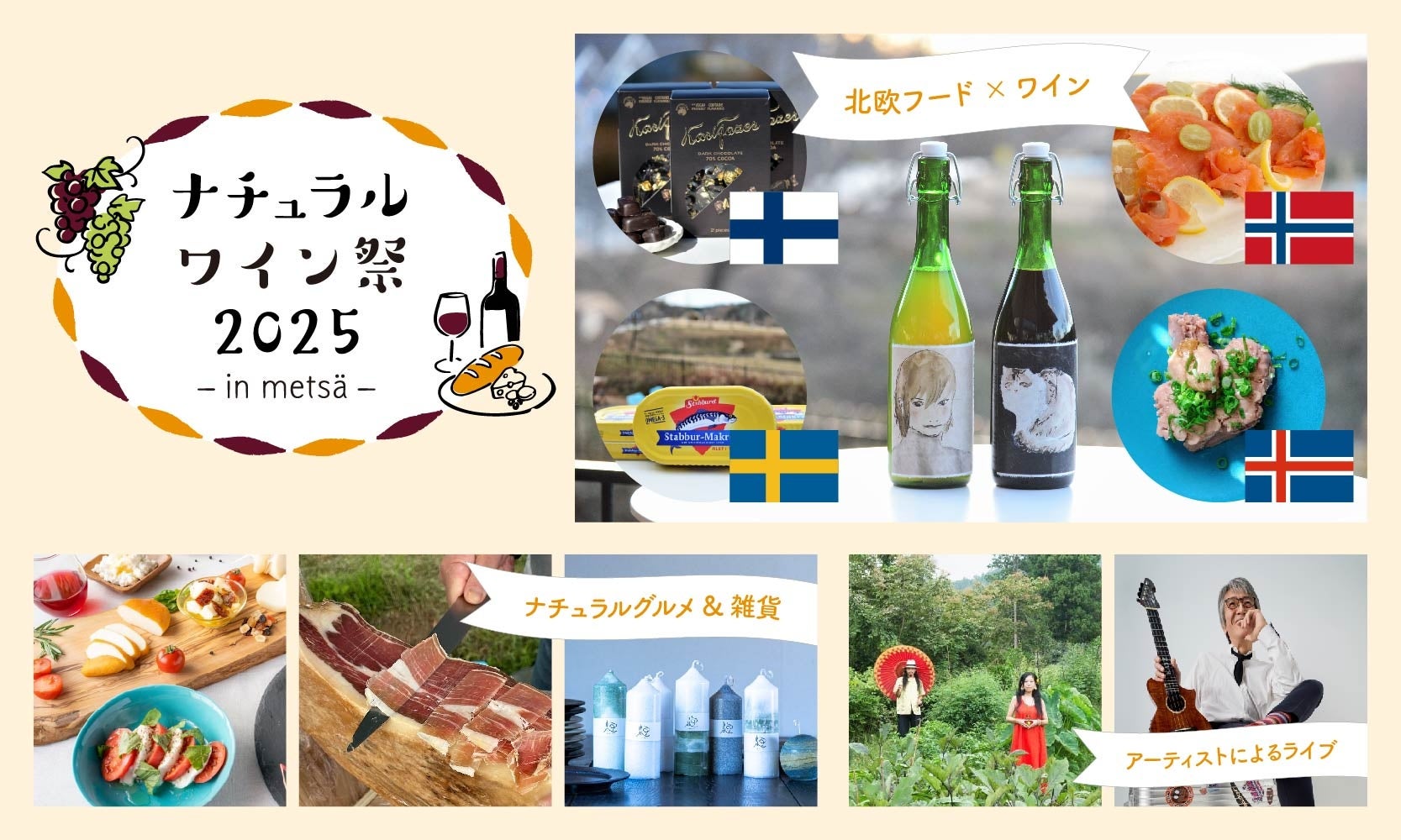 株式会社メッツァ(代表取締役社長:望月潔)が運営する北欧ライフスタイル体験施設「メッツァビレッジ」(埼玉県飯能市)で開催する、武蔵ワイナリープロデュース「ナチュラルワイン祭2025inメッツァ」で楽しめる北欧フードとワインのペアリング特集、トークイベント・ナチュラルフード・クラフト・アーティストのラインナップを紹介します。