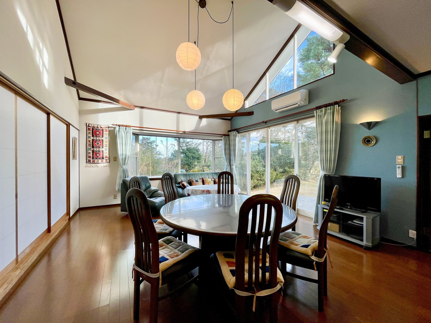 この度新しくオープンする「スイートヴィラ 伊豆一碧湖」は、静岡県伊東市に所在し、大室山北隣のなだらかな上りの丘陵地帯一帯の人気別荘地「イトーピア一碧湖畔別荘地」内の360坪の敷地に建つ温泉付き別荘です。当施設の特徴は、伊豆石を使用したサンルーム仕様の浴室で、広々とした開放的な空間から四季折々の景観を眺めながら、プライベートに伊豆の温泉を楽しむことができます。また、「ゴールド川奈カントリークラブ」に隣接しており、ゴルフを楽しむ旅行にも最適です。滞在の中心となるリビング&ダイニングスペースは、大きな窓と吹き抜けで広々としており、大人数での宿泊の際にもゆったりと利用できます。寝室は洋室1室、和室2室の計3室で、最大14名様まで宿泊可能で複数家族やグループでもご利用いただけます。和室では炬燵も利用可能で、あたたかさを感じる団欒の時間を過ごしていただけます。
