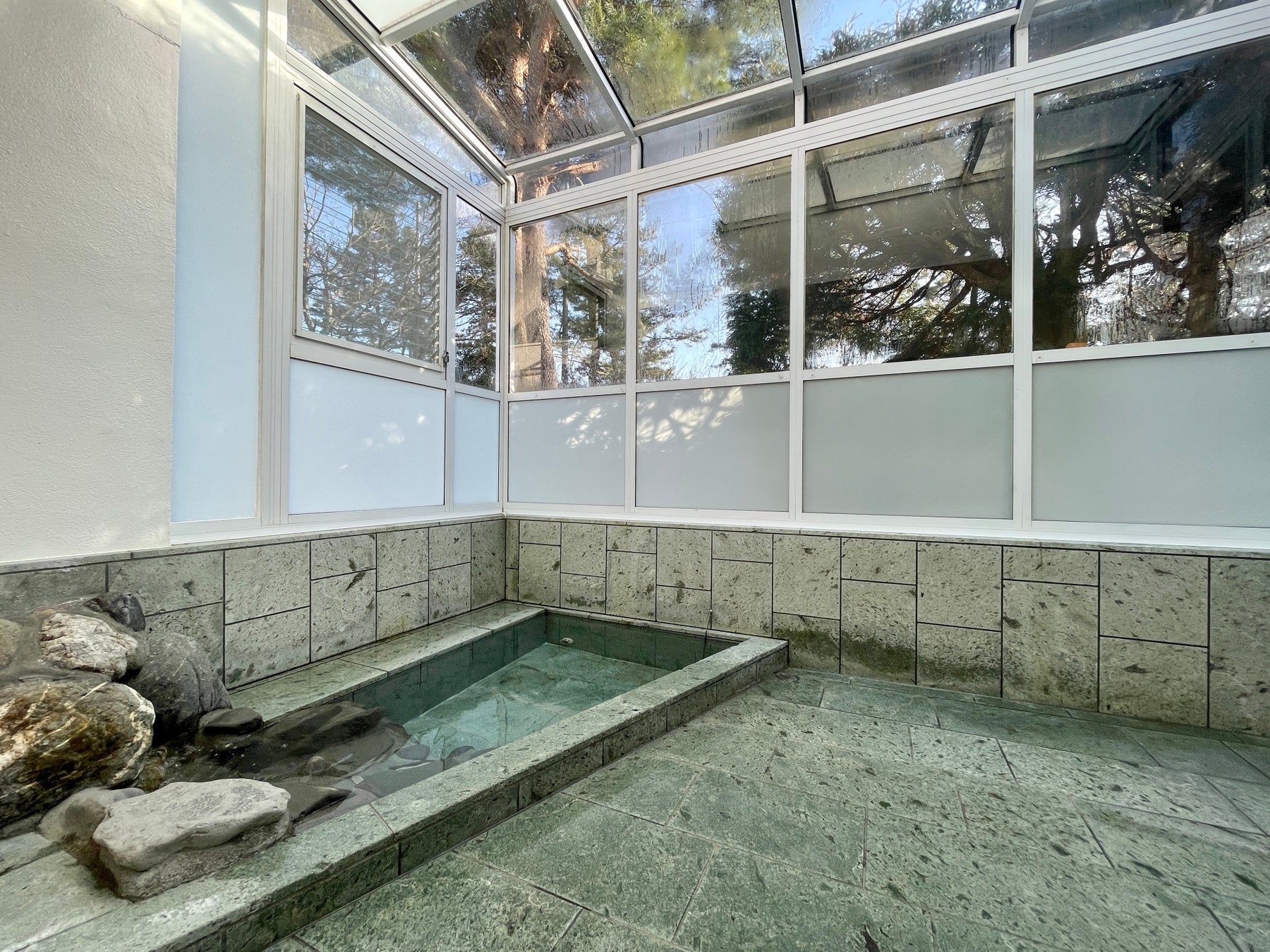 浴室は伊豆石を使用したサンルーム仕様。開放的な空間から景観を眺めながらプライベートに伊豆の温泉を楽しめます。