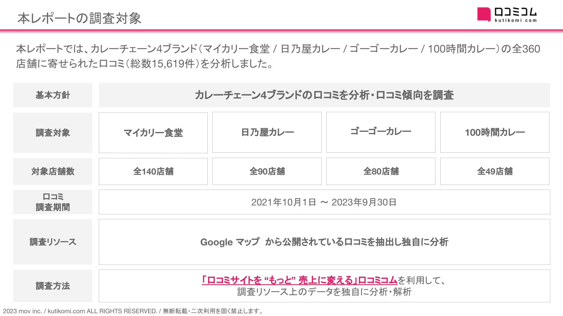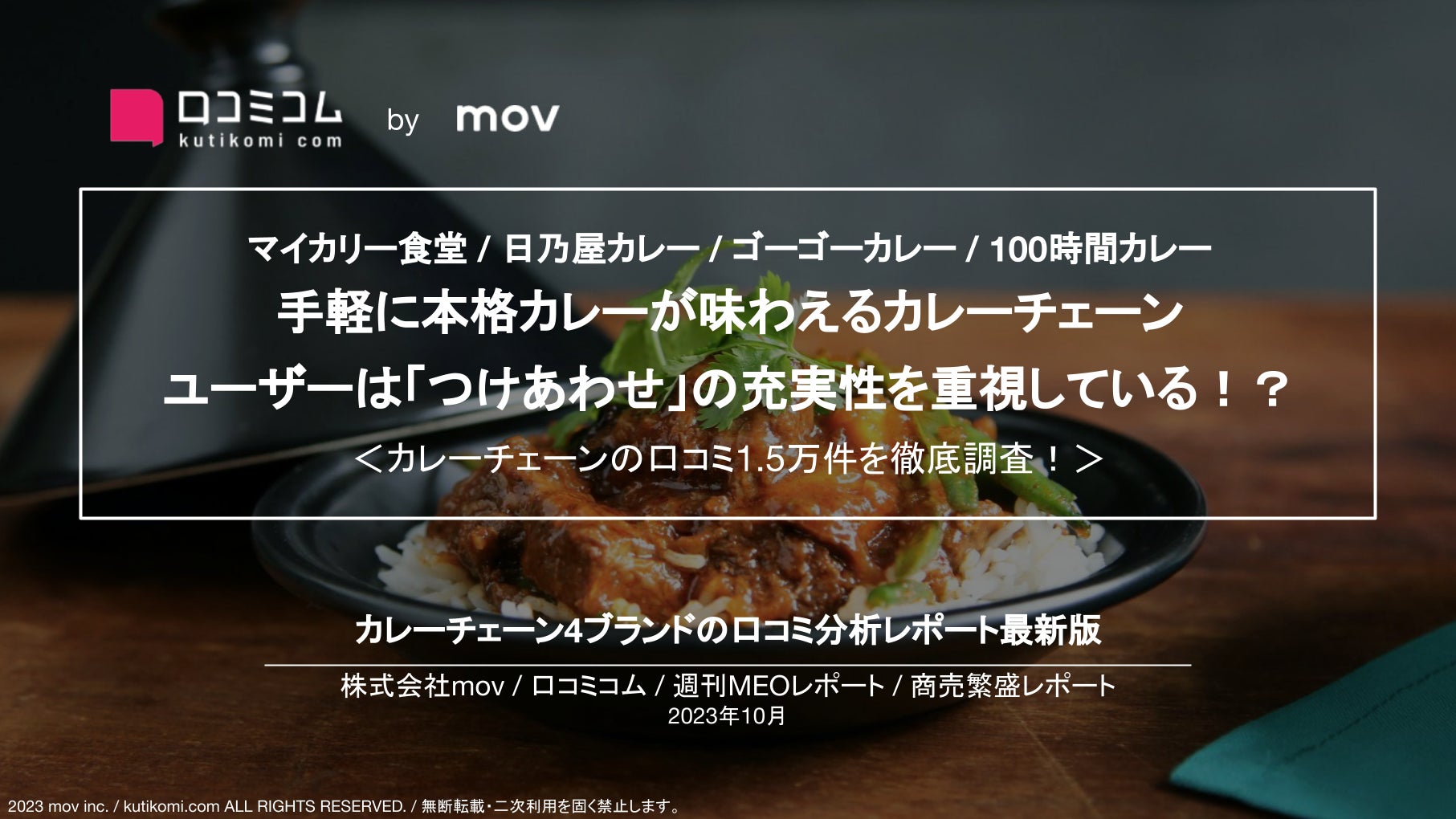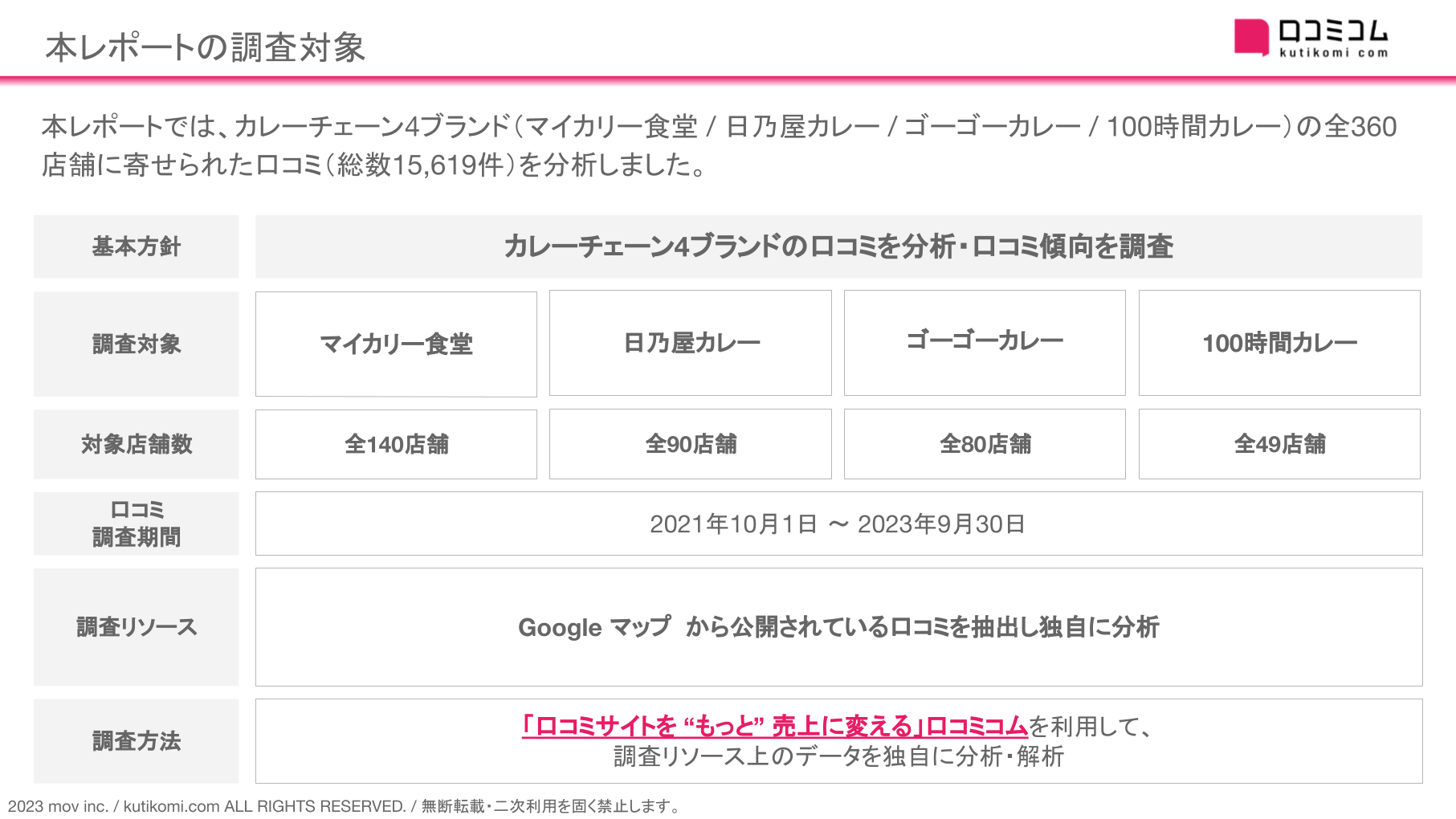 今回は、カレーチェーン4ブランド(マイカリー食堂 / 日乃屋カレー / ゴーゴーカレー / 100時間カレー)に寄せられた約1.5万件の口コミを調査、比較検証をしました。